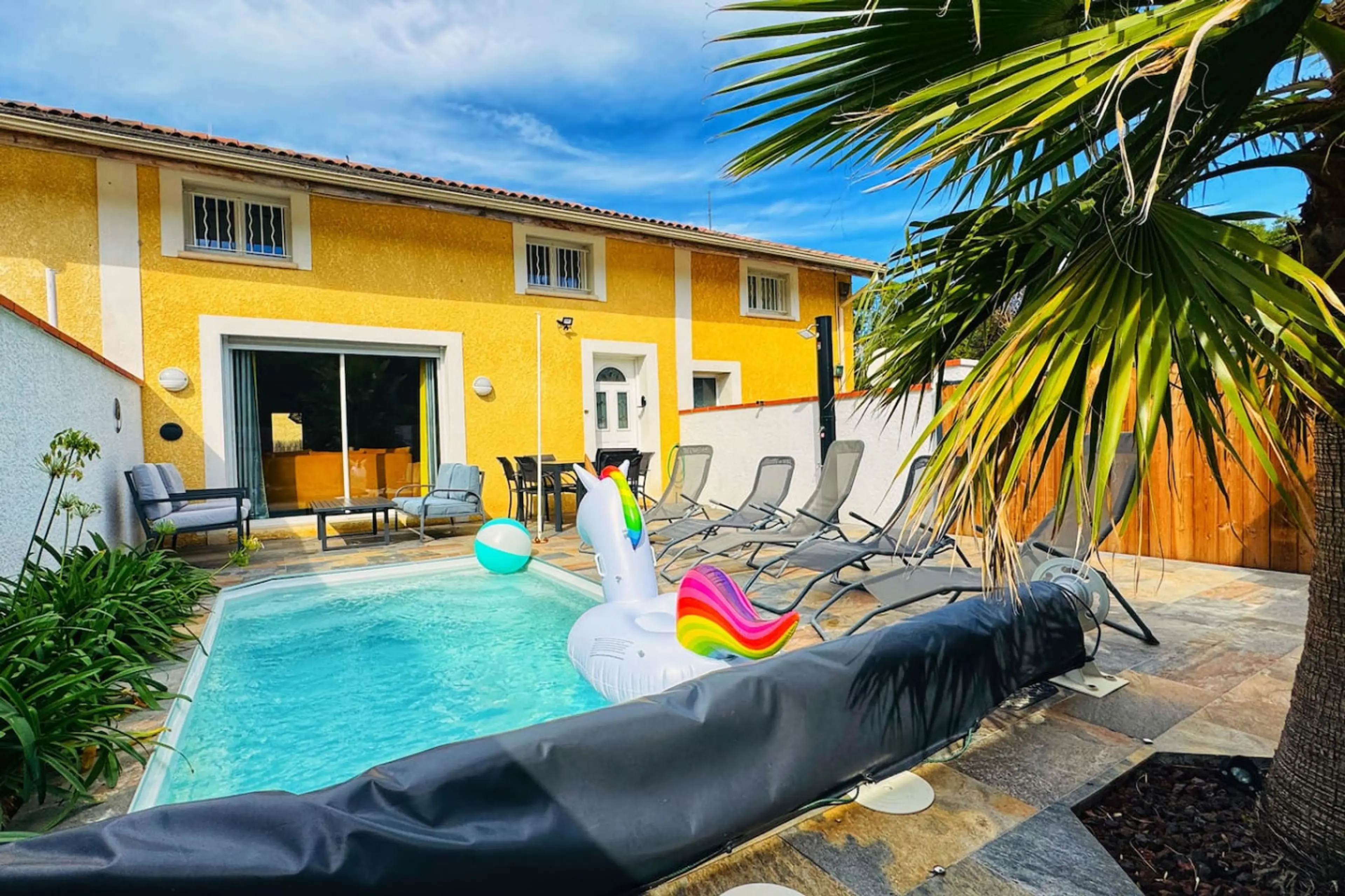 Situé en campagne, à 3mn de l'A68 Albi Toulouse, le Loft accueille jusqu'à 12 personnes. Bénéficiez d'un très grand séjour/salon cuisine équipée avec déco apaisante, terrasse avec piscine chauffée , patio avec table à manger et chaises longues, et le soir venu, 4 chambres avec 4 lits doubles, 2 simp...